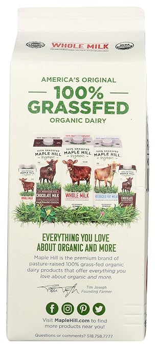 MAPLE HILL ORGANIC GRASS FED WHOLE MILK: Our 100% certified grass-fed organic milk is made from pasture-raised, happy, healthy cows. We believe that the happier the cows, the better-tasting the milk. 100% grass-fed milk is everything you love about organic, and more – better for us, better for cows, better for the land and better for farmers. ORGANIC WHOLE MILK: Creamy, delicious and with no artificial additives, our whole milk is packed with vitamins, nutrients and natural flavor. A great source of calcium for the whole family, this artisanal quality organic whole milk is a satisfying and nutritious beverage when enjoyed on its own, and is also a delicious ingredient in hot chocolate, milkshakes and a range of sweet and savory cooking. USDA ORGANIC: All of our products are PCO certified organic, and our organic grass fed milk which means: no added hormones, no GMOs, and no toxic pesticides. Full of rich, creamy flavor, this Maple Hill whole milk is ultra pasteurized Nutritious and satisfying, Maple Hill organic milk is the perfect snack time milk for toddlers, kids and adults. MAPLE HILL CREAMERY: 100% grass-fed organic dairy. Unlike conventional organic dairy, Maple Hill cows eat 100% grass, have outdoor access 100% of the year and are 100% pasture raised. We are rooted in regenerative farming, sustainable packaging and the ethical treatment of animals. Based in the USA, and our 150 small family run farms are located in NY State.